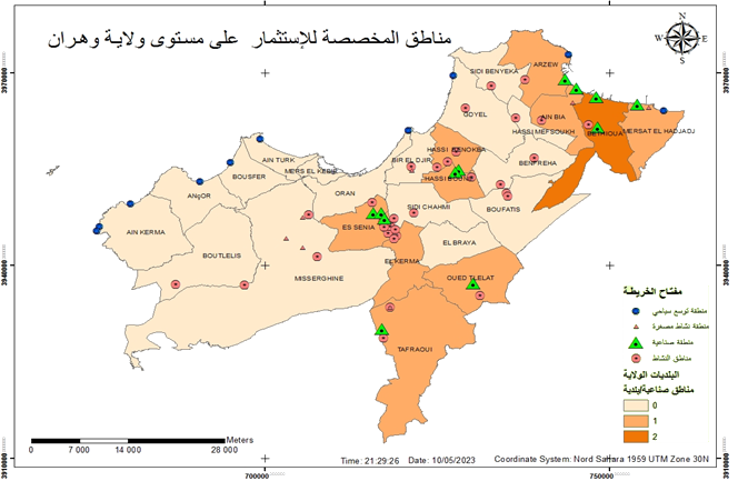 - مناطق النشاط الموجودة (22): منها (منطقة النشاطات، مناطق التخزين، فضاءات العرض) ذات مساحة إجمالية تقدر ب 758.88 هكتار .